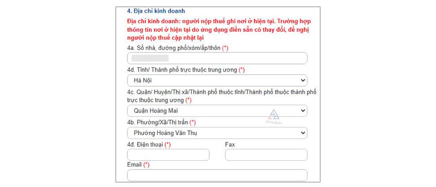 ➧ 4. Địa chỉ kinh doanh: Đây là trường thông tin bắt buộc, NTT phải nhập đầy đủ. Hệ thống tự động hiển thị theo địa chỉ cư trú. NTT có thể sửa lại thành địa chỉ hiện tại đang kinh doanh.