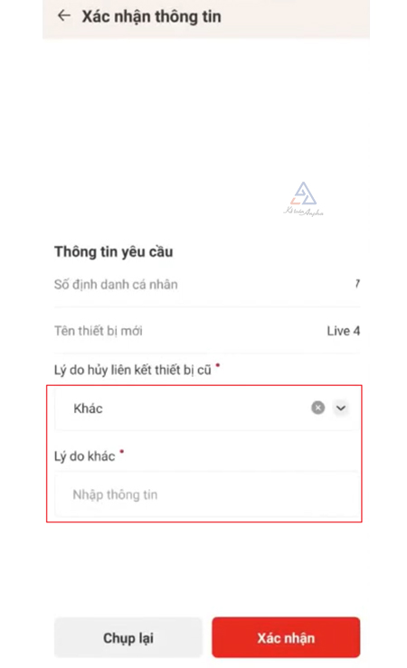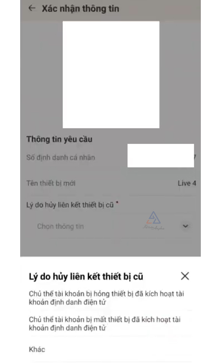 ➧ Bước 8: Sau khi xác nhận các thông tin nêu trên đã chính xác thì tại mục “Lý do hủy liên kết trên thiết bị cũ” ➝ Chọn lý do phù hợp;