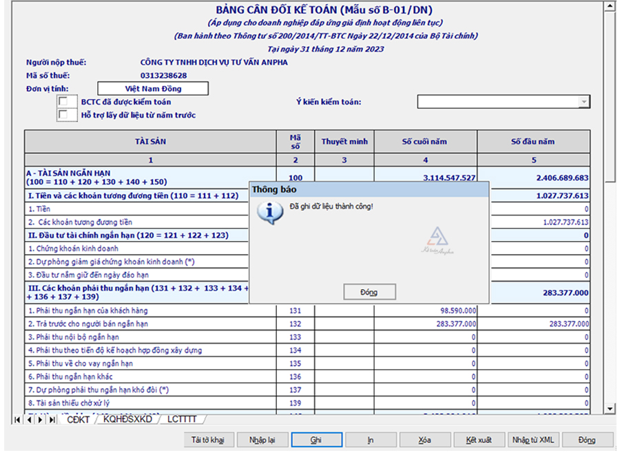 - Nhập tờ khai: Điền đầy đủ các thông tin được yêu cầu trong bảng cân đối kế toán, báo cáo kết quả hoạt động sản xuất kinh doanh và lưu chuyển tiền tệ. Sau khi điền thông tin xong, nhấn ô “Ghi” và hiển thị thông báo “Đã ghi dữ liệu thành công!” là hoàn tất;