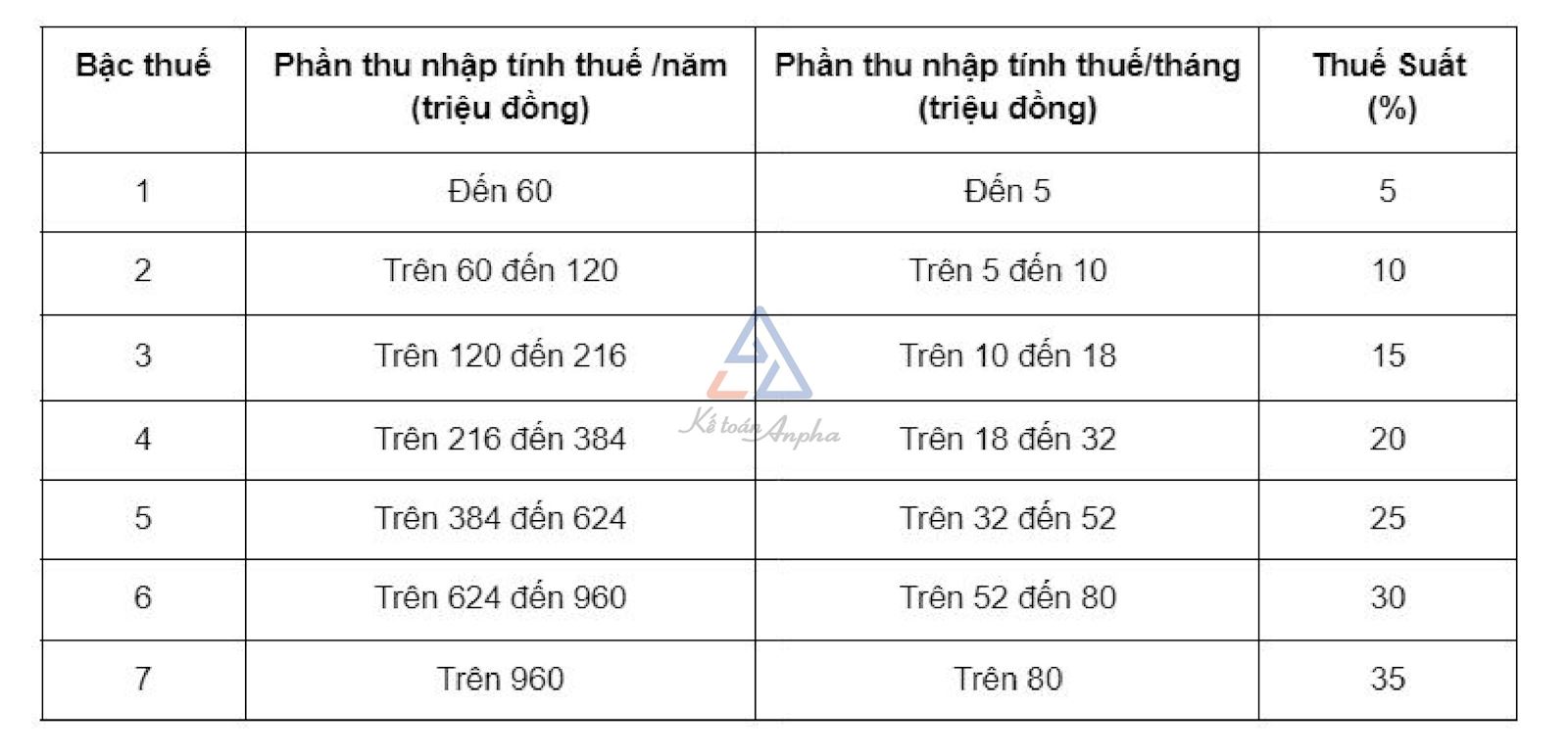 Bảng thuế suất thuế TNCN (theo biểu lũy tiến từng phần):