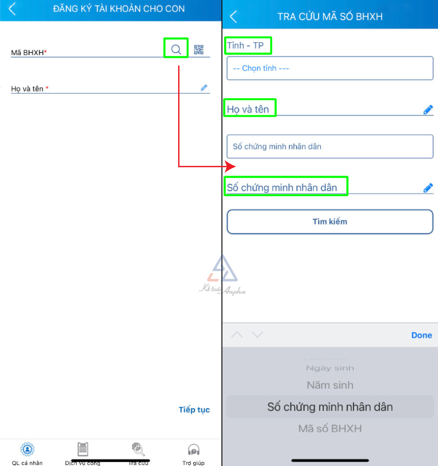 Để kết quả chính xác hơn, phụ huynh có thể chọn thêm các tiêu chí tìm kiếm như: ngày sinh, năm sinh, số CMND, mã số BHXH. Sau đó, chọn “Tìm kiếm”.