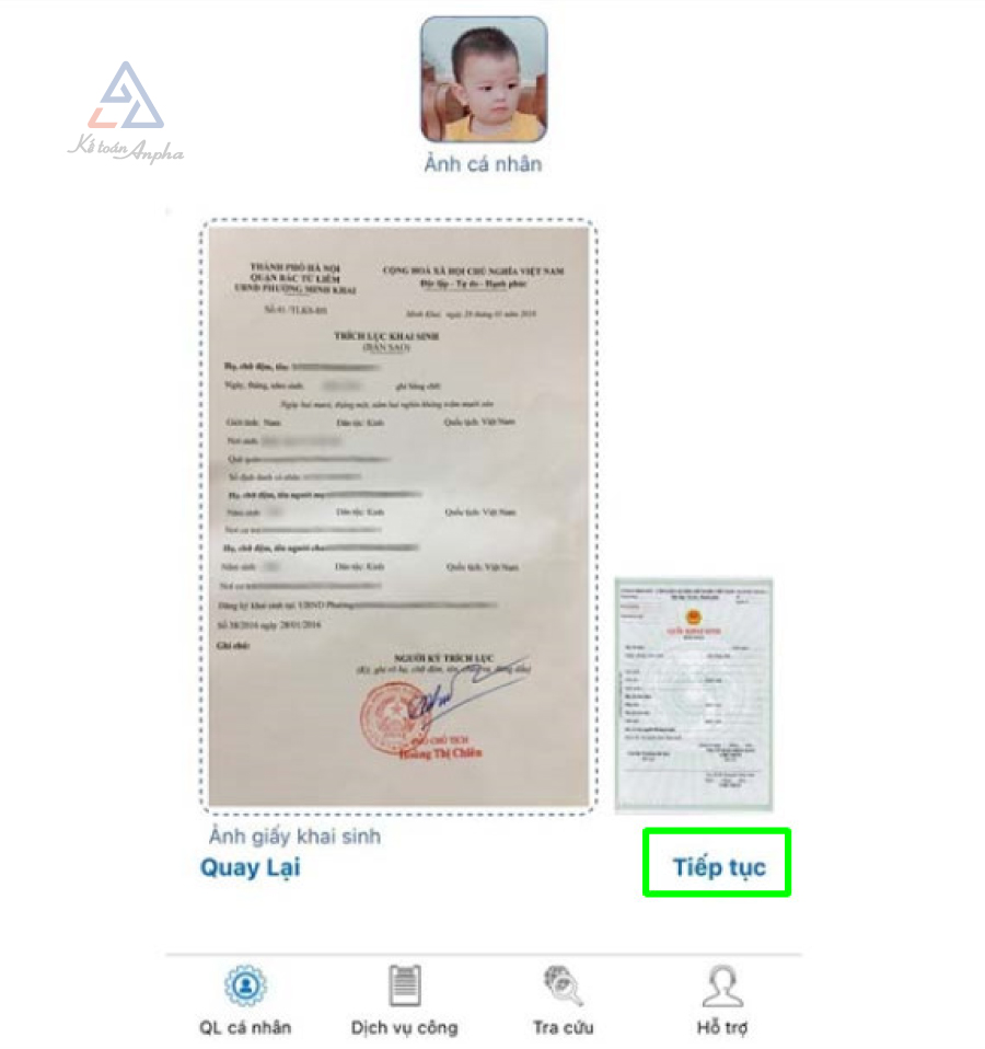 Bước 4: Cập nhật ảnh giấy khai sinh và ảnh cá nhân của con