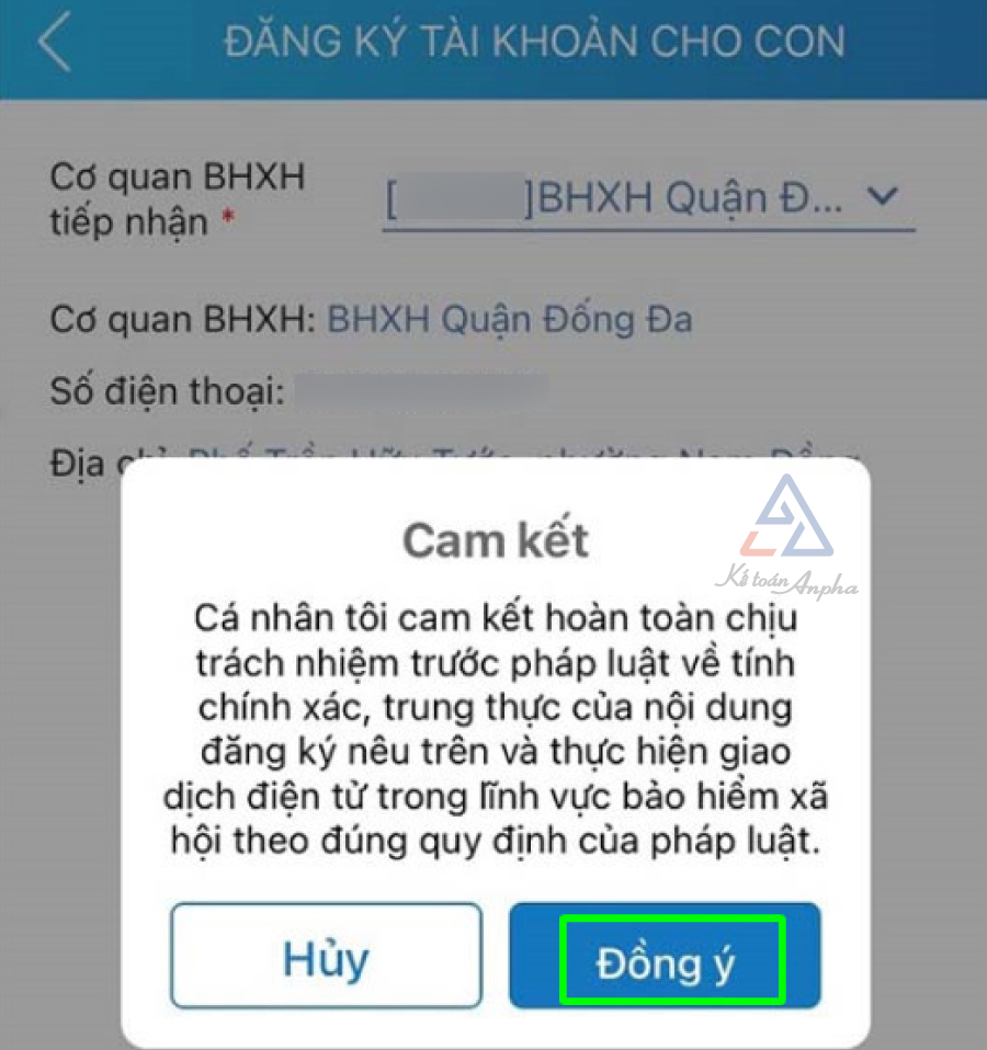 Phụ huynh nhấn “Gửi”, hệ thống sẽ gửi thông báo cam kết (như hình minh họa), phụ huynh xác nhận bằng cách chọn “Đồng ý”.