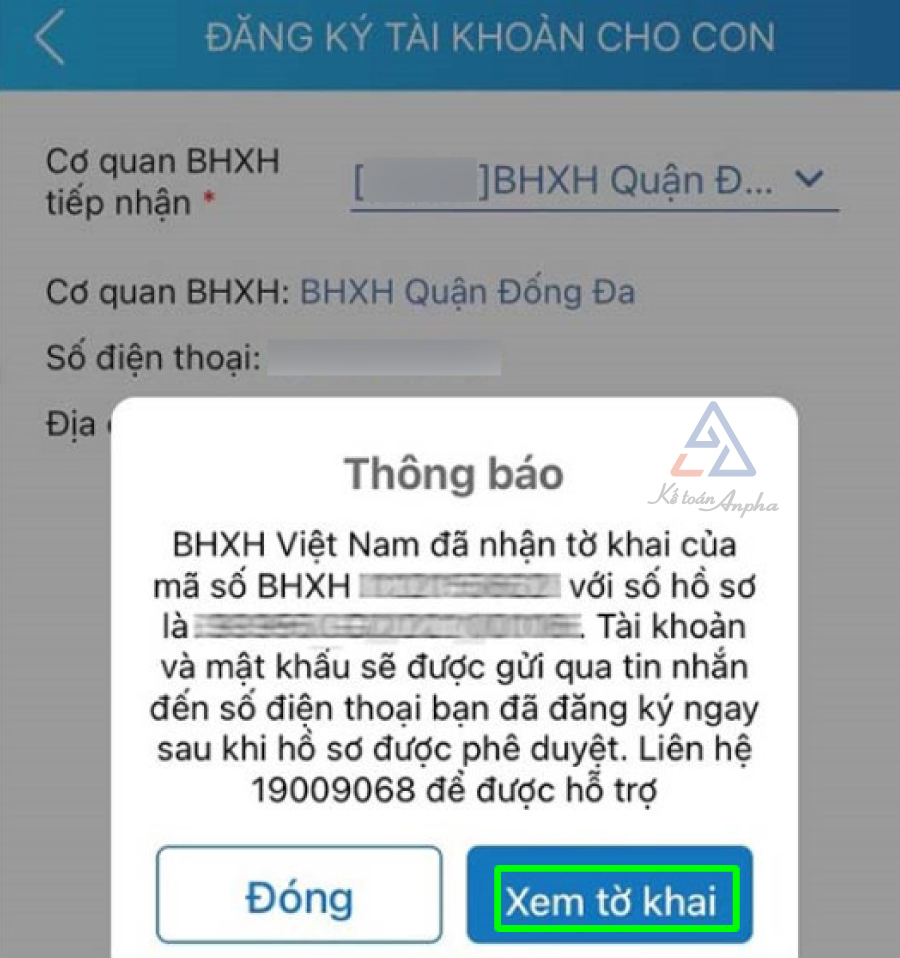Phụ huynh muốn xem lại chi tiết tờ khai chọn “Xem tờ khai” hoặc nhấn “Đóng” để hoàn tất thủ tục đăng ký VssID cho con.