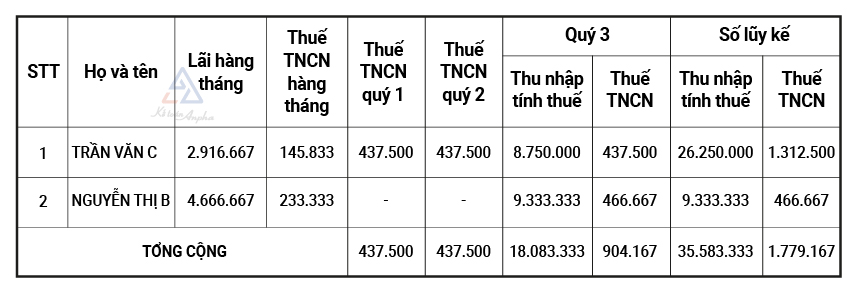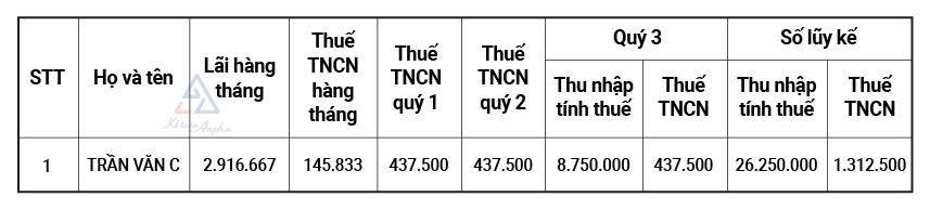 - Thu nhập tính thuế TNCN = Tiền lãi hàng tháng = 500.000.000 x (7% / 12) = 2.916.667 đồng;