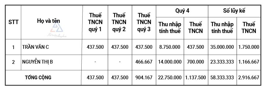 - Thuế TNCN phải nộp = 35.000.000 đồng x 5% = 1.750.000 đồng.