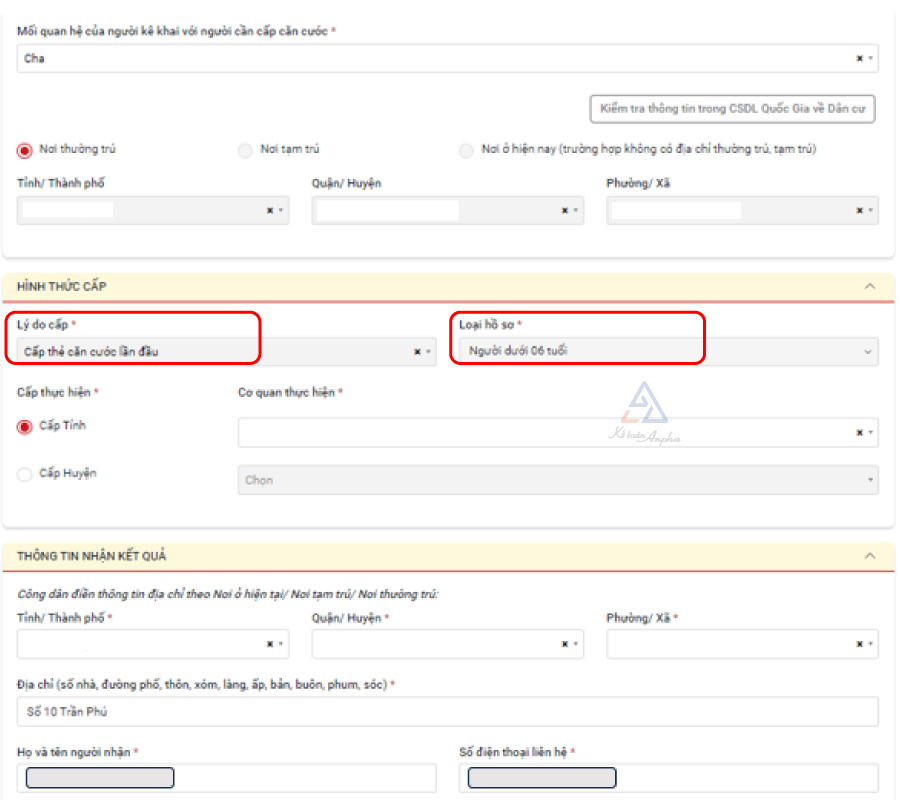 ➧ Bước 7: Tại mục “Hình thức cấp” chọn “Cấp thẻ căn cước lần đầu”, tiếp tục chọn loại hồ sơ “Người dưới 6 tuổi” (*) và điền thông tin nơi nhận kết quả;