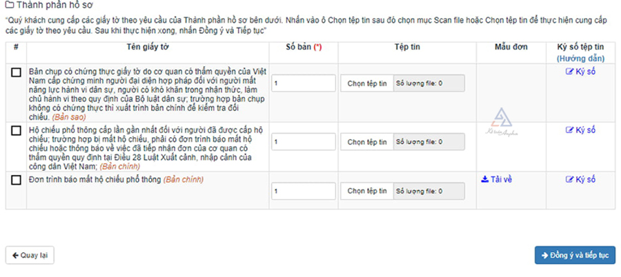 ➨ Bước 5: Bạn kéo đến cuối trang, tại mục “Thành phần hồ sơ” >> Chọn “Chọn tệp tin” >> Chọn “Scan file” hoặc “Chọn tệp tin” để thực hiện cung cấp các giấy tờ theo yêu cầu tại trang. Nhấn “Đồng ý và tiếp tục” để hoàn tất thủ tục.