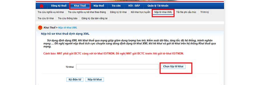 - Sau đó chọn “Khai thuế”, rồi chọn “Nộp tờ khai XML”, nhấp vào “Chọn tệp tờ khai”, chọn tệp tờ khai đã kết xuất ra ở bước 1, rồi chọn “Ký điện tử” và “Nộp tờ khai”;