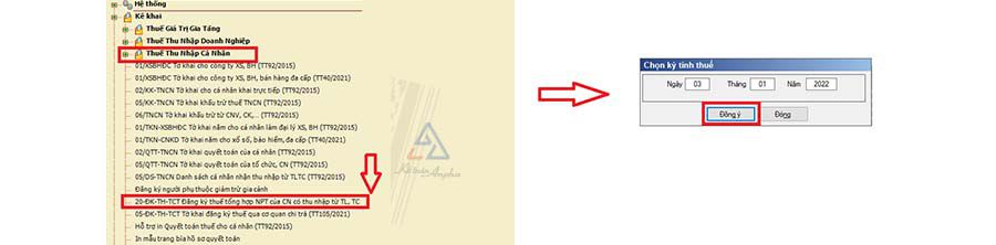 - Vào mục thuế “Thu nhập cá nhân”, chọn tờ khai 20-ĐK-TH-TCT, rồi chọn ngày, sau đó bấm vào “Đồng ý”;