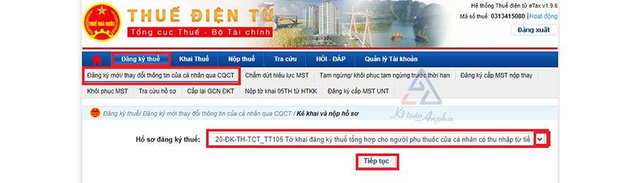 - Vào “Đăng ký thuế”, rồi chọn “Đăng ký mới/thay đổi thông tin của cá nhân qua CQCT”, chọn “Hồ sơ đăng ký thuế” là mẫu 20-ĐK-TH-TCT_TT105;