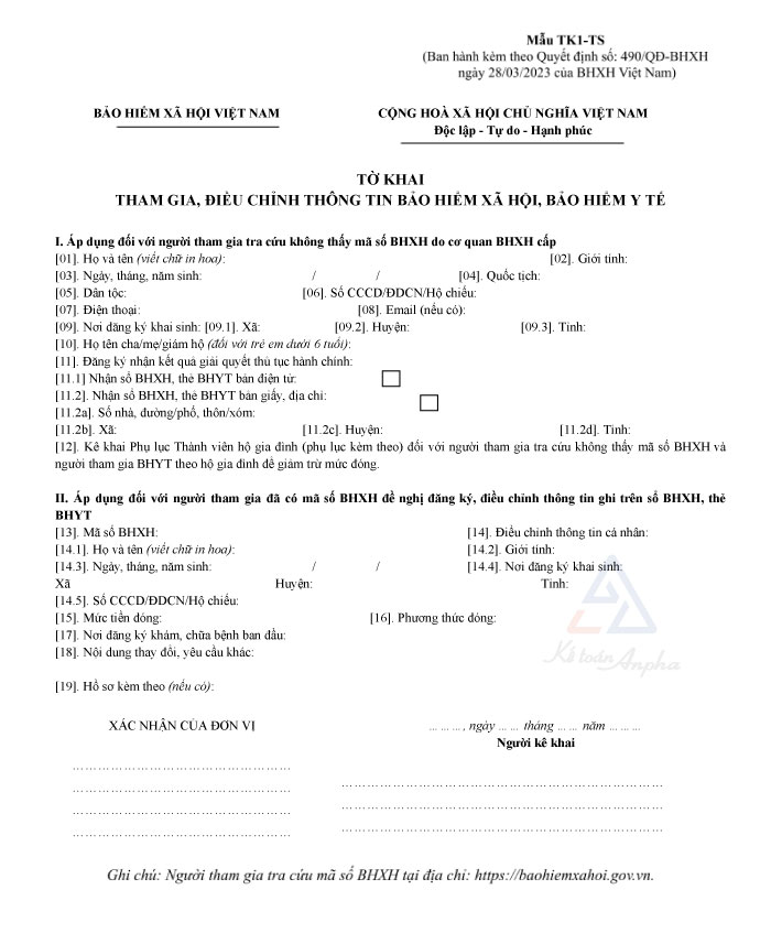 Từ ngày 01/04/2023 bạn phải áp dụng mẫu TK1-TS tờ khai tham gia, điều chỉnh thông tin BHXH, BHYT theo Quyết định 490/QĐ-BHXH.