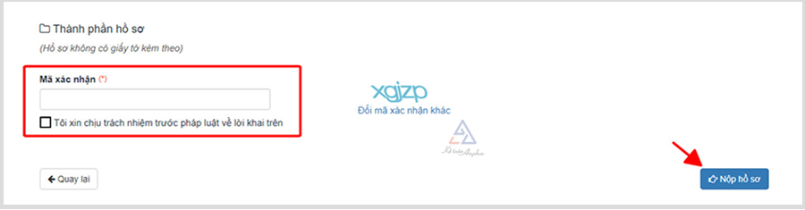 ➨ Bước 7: Nhập mã xác nhận, tích chọn “Tôi chịu trách nhiệm trước pháp luật về lời khai trên” và ấn “Nộp hồ sơ”.