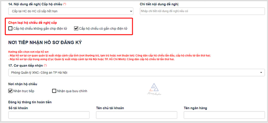 Đối với phần “Đăng ký thông tin hoàn tiền”, bạn điền thông tin số tài khoản ngân hàng của bạn để trong trường hợp hồ sơ bị từ chối, bạn sẽ được hoàn lại lệ phí xin cấp hộ chiếu đã nộp về tài khoản.
