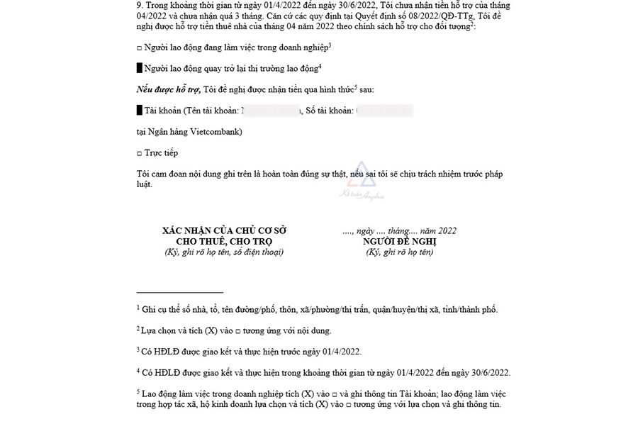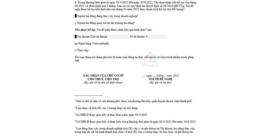 - Mục số 9: Điền tháng cần nhận hỗ trợ, ví dụ người lao động cần hỗ trợ tiền thuê nhà tháng 4 thì điền tháng 04/2022.