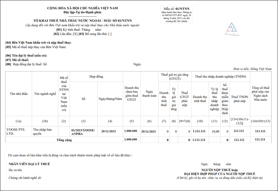 Công ty YOOSE được xác định là nhà thầu nước ngoài đang có thu nhập từ bản quyền tại Việt Nam. Do vậy thuế suất thuế GTGT khi nộp thay nhà thầu nước ngoài là không chịu thuế và thuế suất thuế TNDN khi nộp thay nhà thầu nước ngoài là 10%.