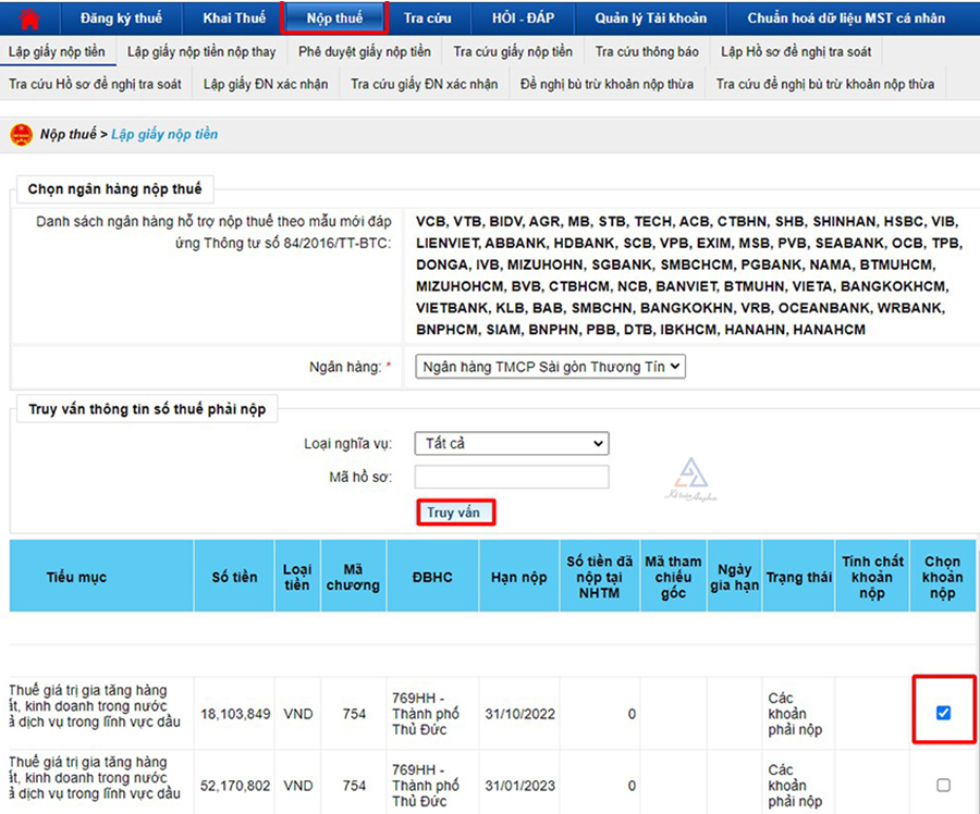 Kết quả hiện ra là các tiểu mục thuế doanh nghiệp cần phải nộp, bạn có thể tiến hành tích chọn khoản mục thuế cần nộp và nộp ngay.