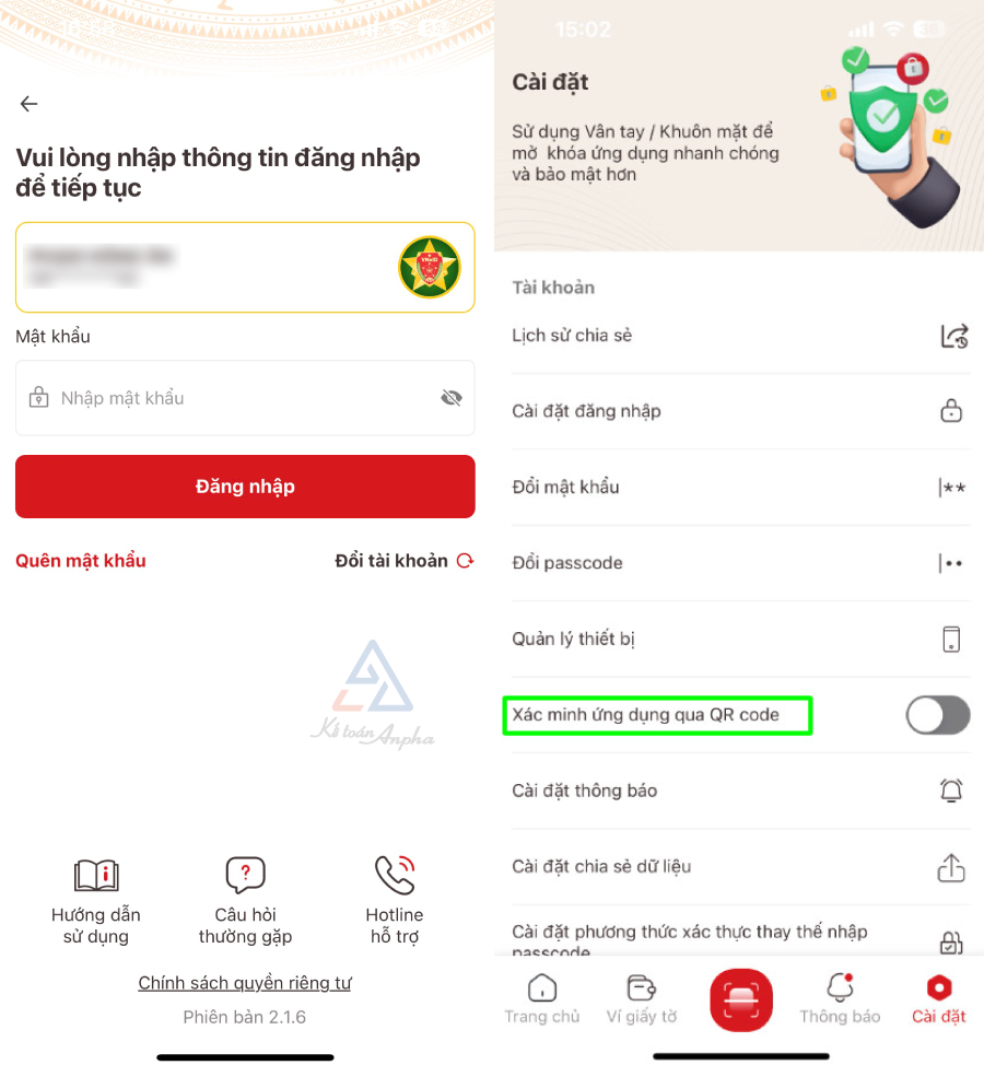 ➧ Bước 1: Đăng nhập tài khoản VNeID mức độ 2 >> chọn mục “Cài đặt” và bật tính năng “Xác minh ứng dụng qua QR code”.